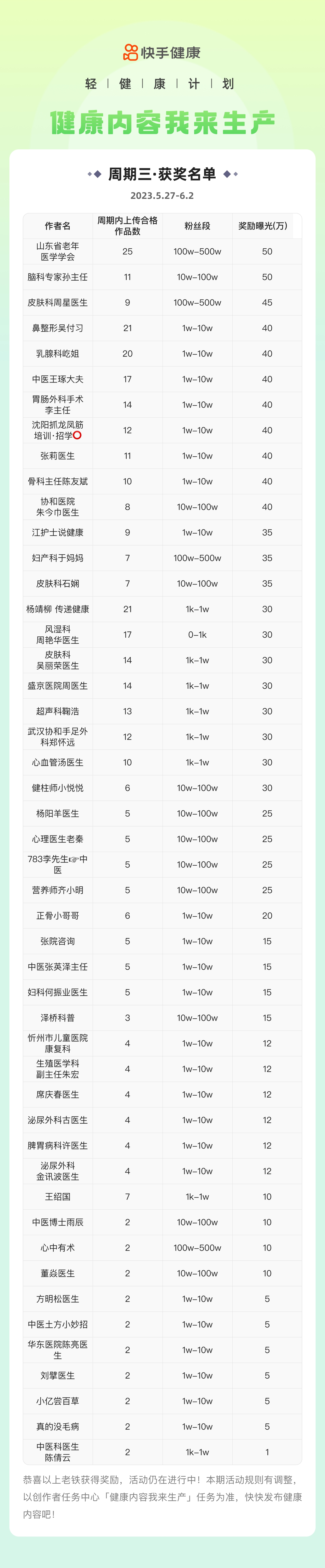 “泽桥医生”在快手“轻健康计划”第三周期获奖