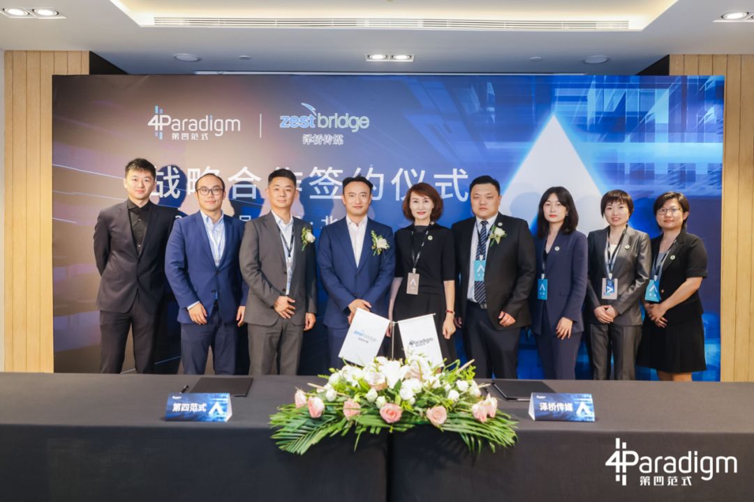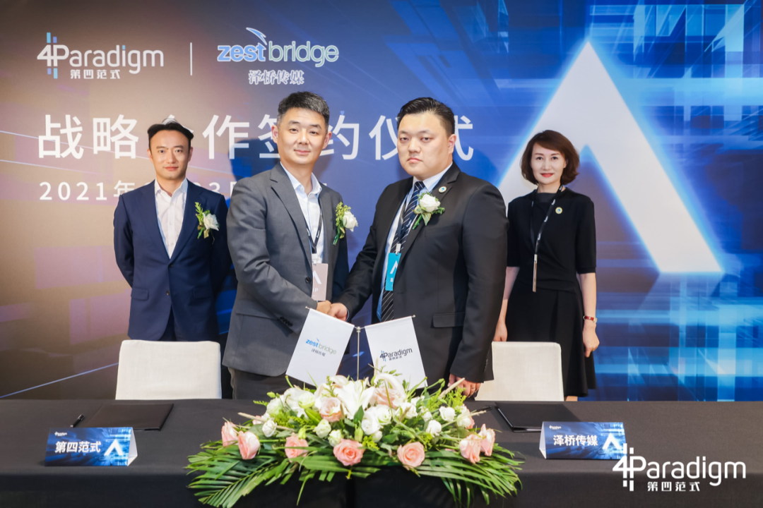 2021年6月23日下午,在第四范式举办的“转型新范式:第四范式2021新品发布会暨企业智能化转型峰会”上,北京泽桥传媒与第四范式达成战略合作,泽桥传媒董事长兼总经理段小霞、泽桥传媒音视频事业部总经理任翰宗、第四范式总裁裴沵思、第四范式副总裁何宁出席签约仪式,开启智慧媒体服务新范式。