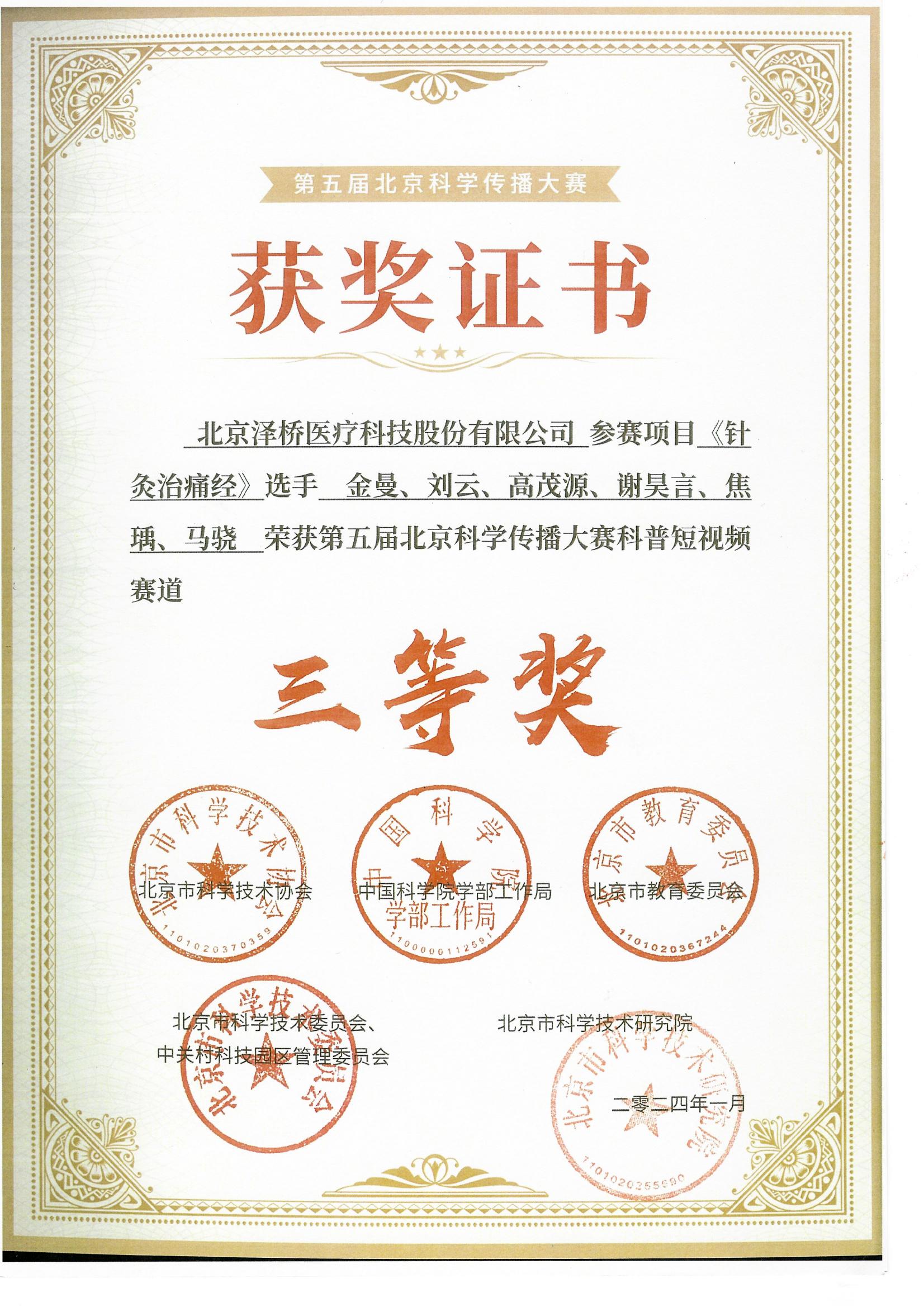 北京泽桥医疗科技股份有限公司参赛项目《针灸治痛经》选手金曼、刘云、高茂源、谢昊言、焦瑀、马骁荣获第五届北京科学传播大赛三等奖!