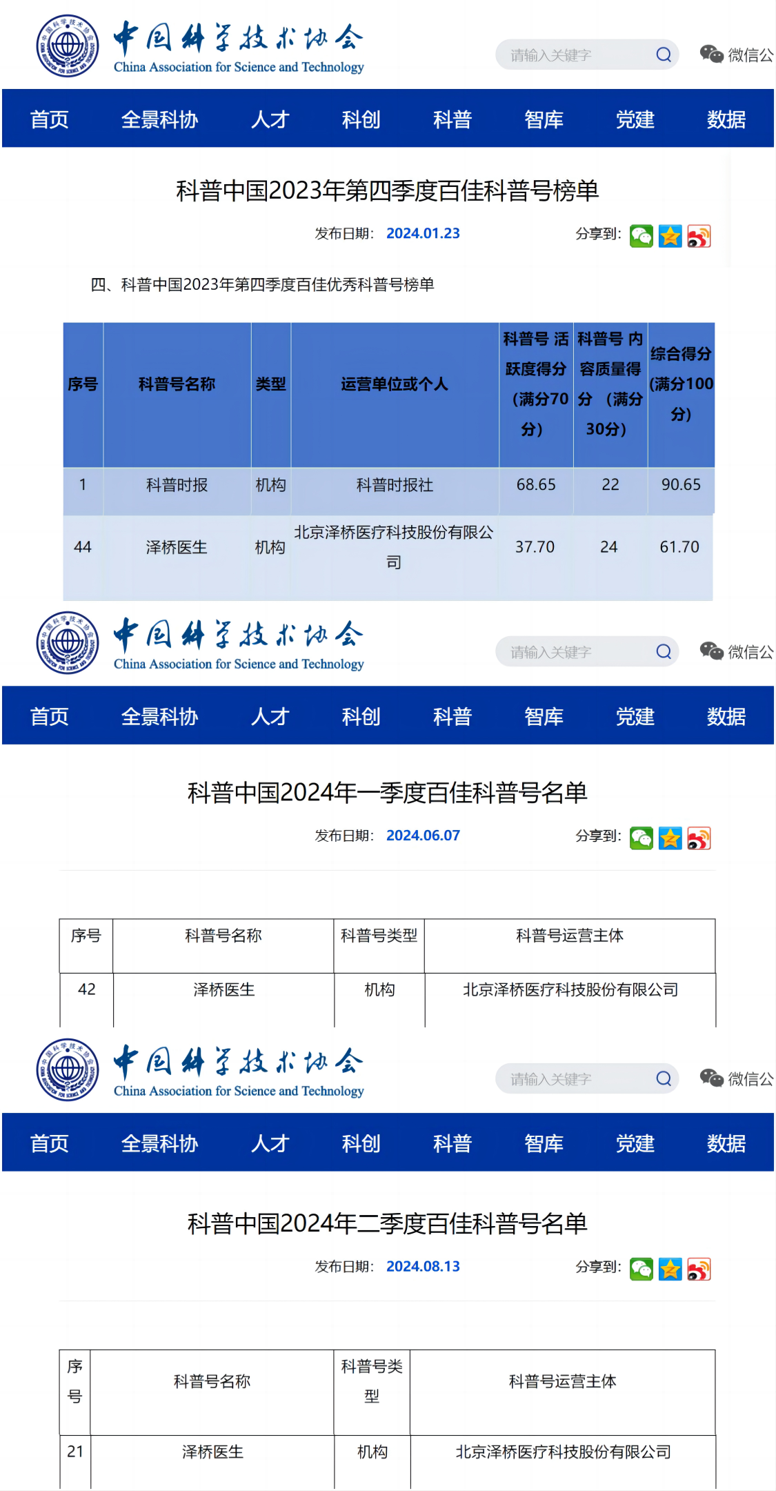 “科普中国”是中国科协为深入推进科普信息化建设而塑造的全新品牌,经过8年发展,逐步形成以“内容库、专家库、团队库、传播矩阵、活动矩阵”为基础底座,以科普中国资源服务、科普中国网、科普中国APP、科普中国新媒体为应用架构。目前,科普中国已成为国内最具权威性的科学传播品牌和最大的科普资源库之一。科普中国运营团队自2024年1月开始以季度为周期开展“百佳优秀科普号”的评选活动。目前公布的连续三个季度泽桥医生均上榜!