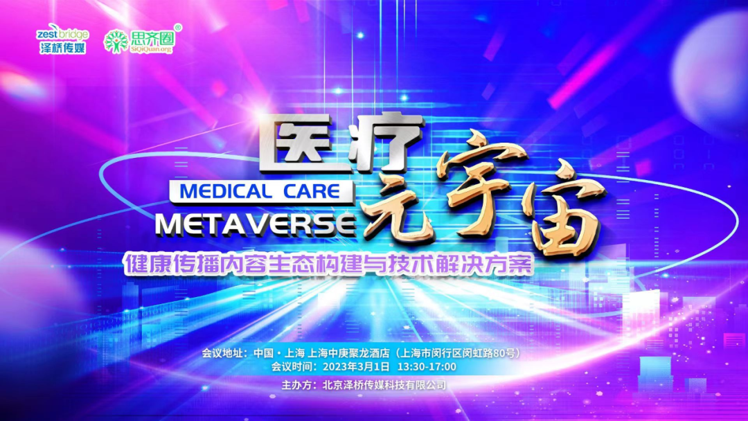 2023年3月1日下午1:30由北京泽桥传媒科技有限公司与思齐圈联合主办《第六届健康传播论坛—医疗元宇宙:健康传播内容生态建构与技术解决方案》会议,以线上线下相融合的形式,在上海中庚聚龙酒店成功举办。本论坛立足健康传播,旨在利用元宇宙新技术再造传播形态,重塑传播模式;变革传播路径;推动健康传播走向数字文创新纪元,借第七届 MMC 医学市场年会东风,第六届健康传播论坛圆满结束!
