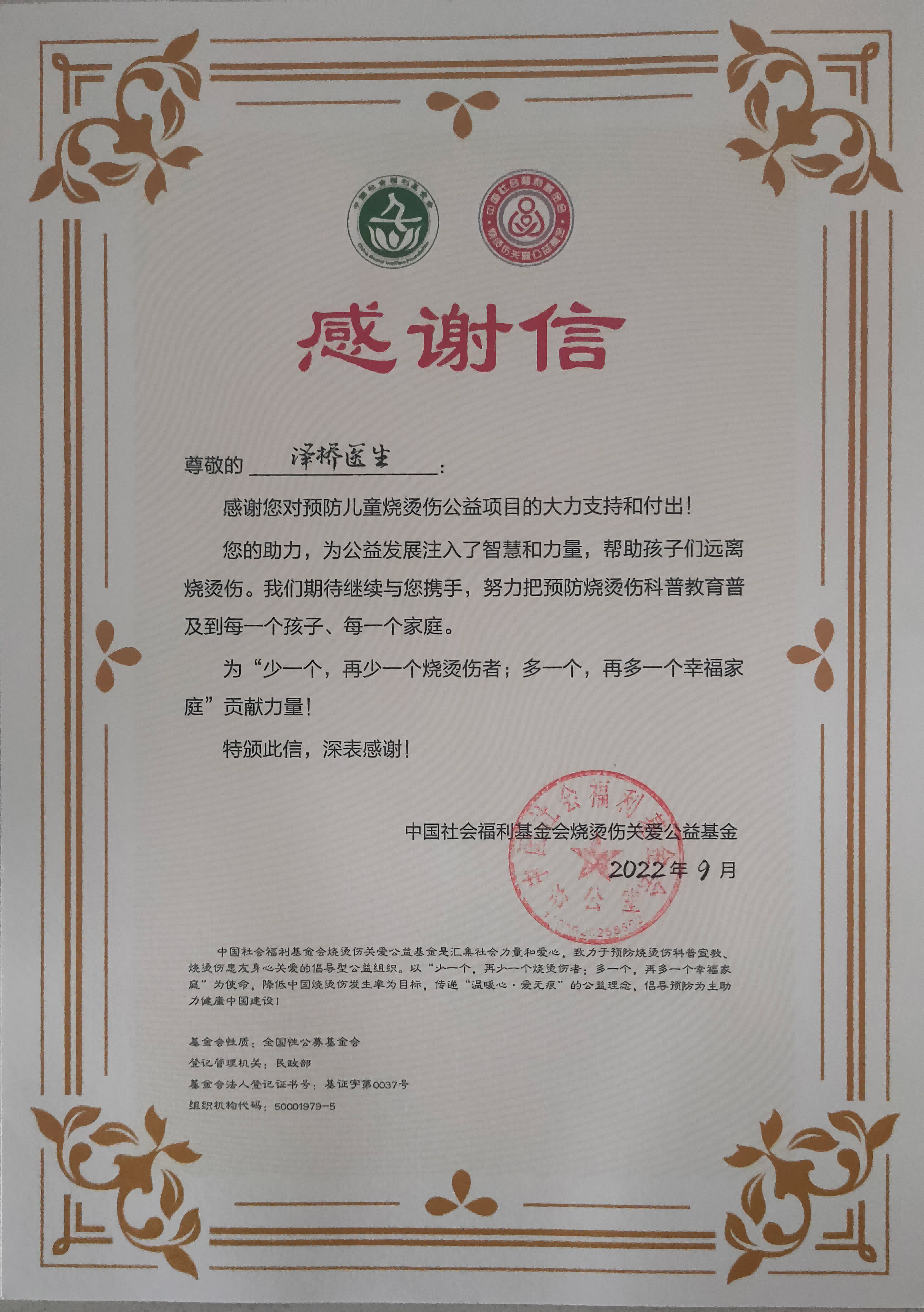 参与中国福利基金会烧伤关爱公益基金,助力自救科普宣传